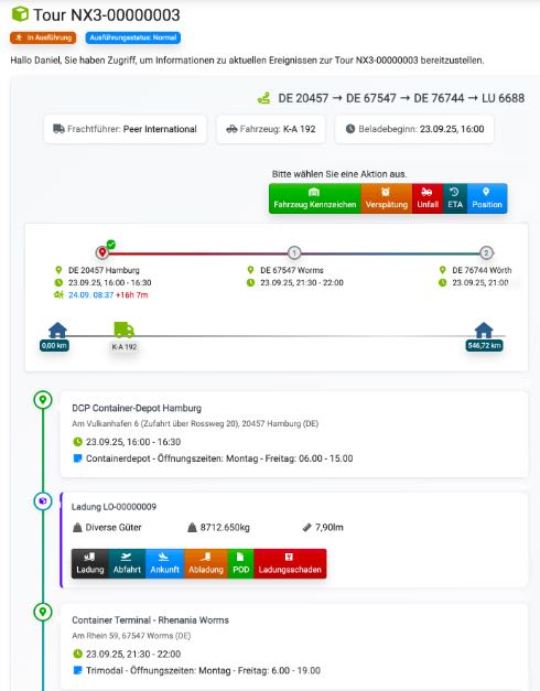 Fahrer erhalten alle Informationen digital, inklusive CMR & Ladeinstruktionen. Statusupdates laufen live zurück ins System.